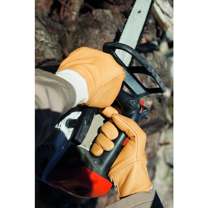 Waterafstotende mechanische lederen handschoen met zeer goede polsbescherming dankzij de slagaderbeschermer