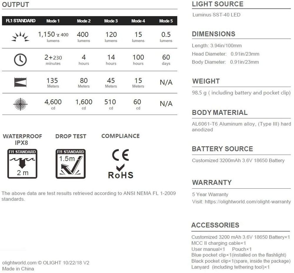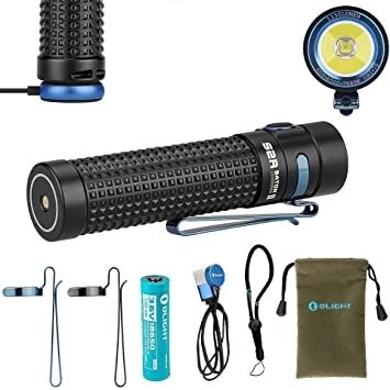 Met Olight draagtasje, polsbandje, opbergdoosje accu, gebruiksaanwijzing.
