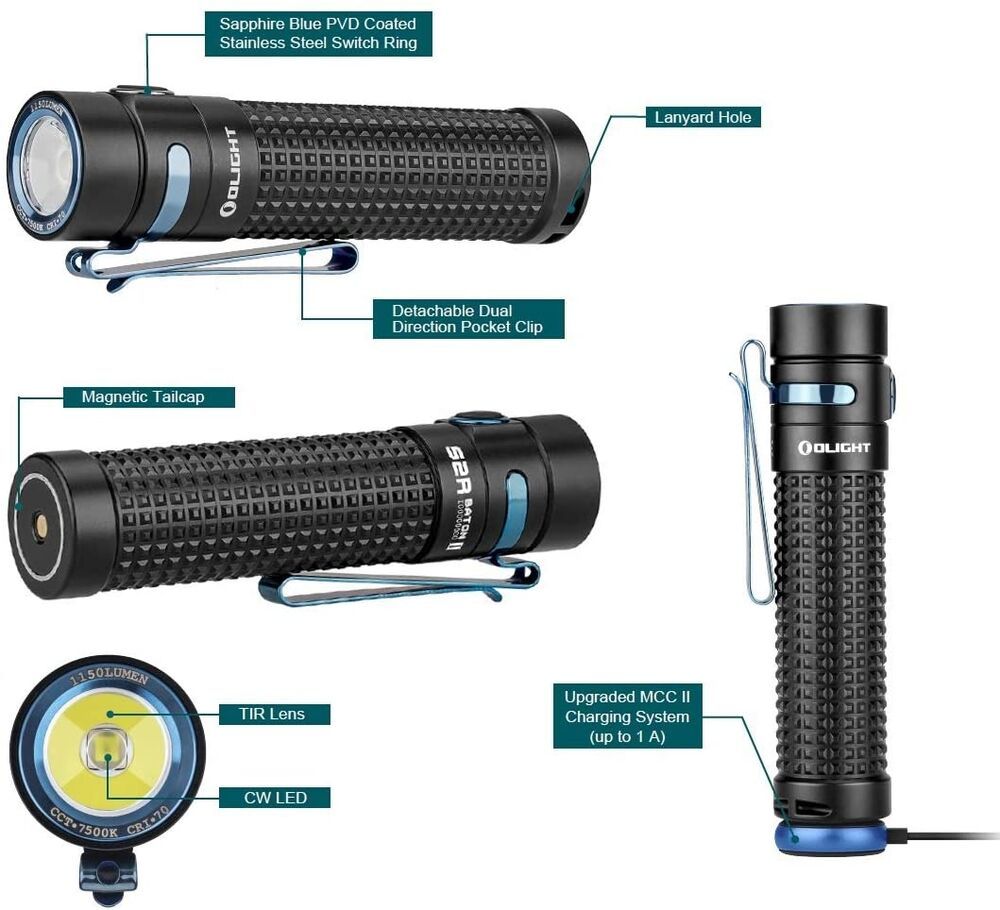 "Nieuw model: na de revolutionaire compacte oplaadbare S1RII is er nu ook de S2RII. De S2RII Baton heeft een nieuwe USB laadkabel die nog platter is, laadt sneller op en geeft de laadstatus weer via een LED indicator in het midden. De laadstation van de S2RII Baton is eventueel te gebruiken om andere Olight modellen mee op te laden