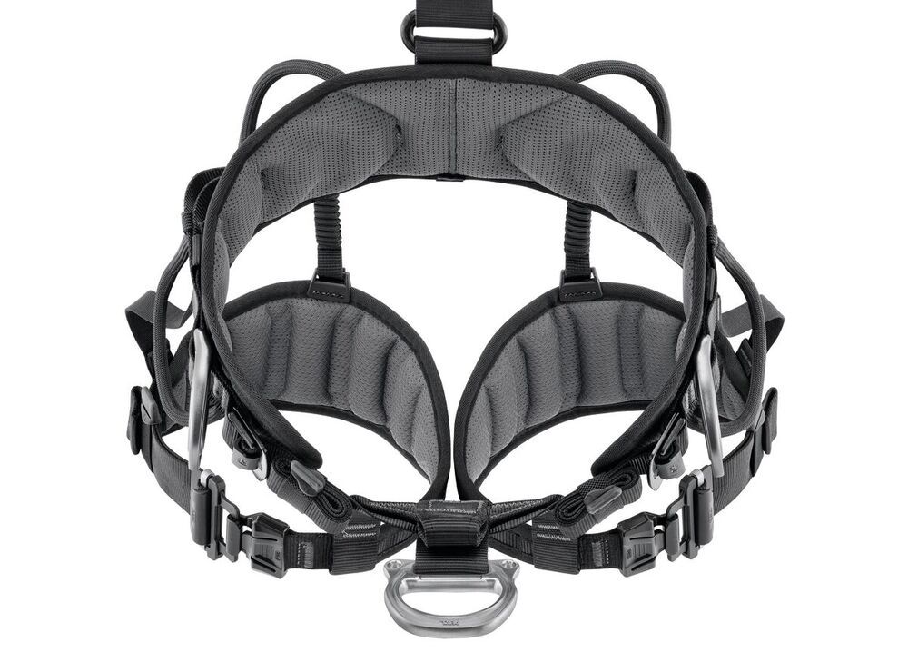 - Elastische beenlusbanden (vervangbaar en beschikbaar als accessoire) zorgen ervoor dat het harnas de juiste afstelling behoudt, of de gebruiker nu loopt of hangt