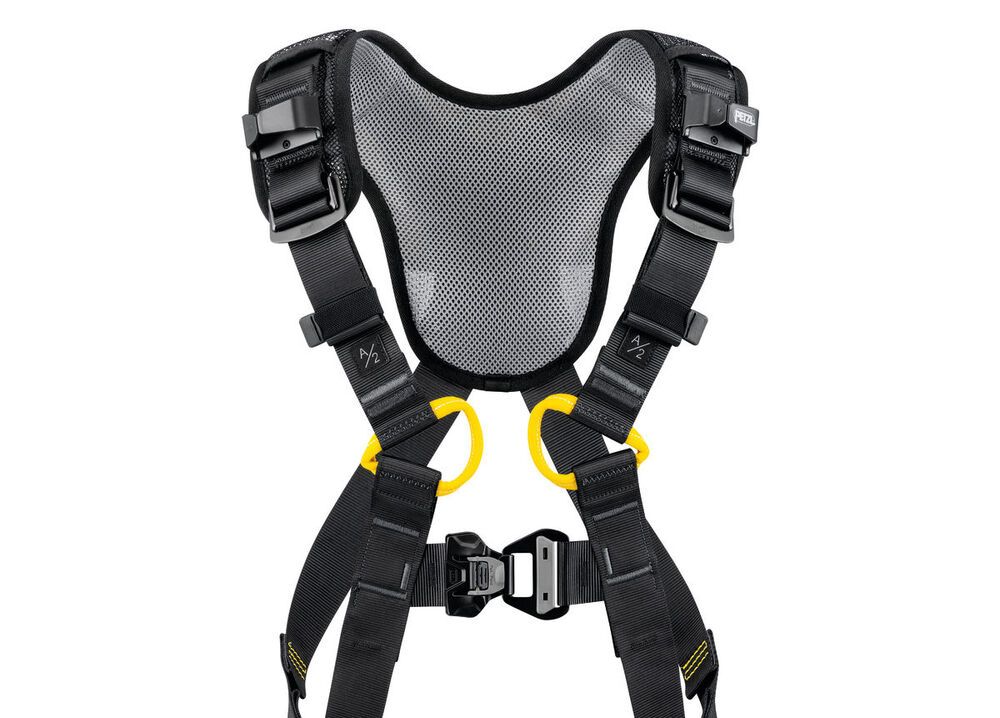 - Opbergsysteem voor de MGO-connectoren op valbeveiligingslijnen bevinden zich op elke schouderband; in geval van een val, laat het systeem de MGO-connectoren los en kan de absorber worden ingezet