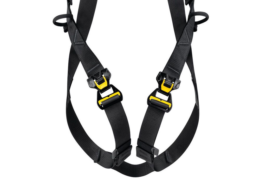 - Harnas kan worden aangetrokken met beide voeten op de grond met behulp van FAST LT PLUS gespen op de beenlussen en borstband; deze maken het snel en eenvoudig vast- en losmaken mogelijk zonder verlies van afstelling, zelfs met handschoenen, en het ontgrendelingssysteem beperkt het risico op onbedoeld losmaken