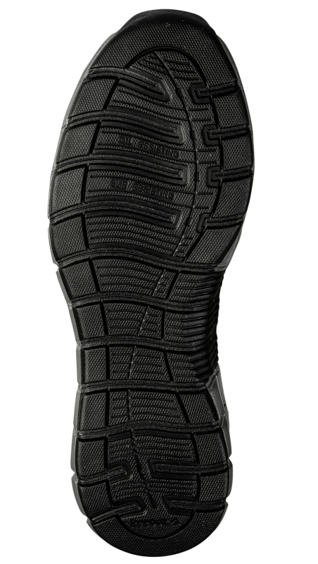 Sportieve werkschoen in de kleur zwart met gepatenteerde Excel Light dempende grijze buitenzool met unieke memory tech binnenzool. Extra licht (450 gr.), v.v. slijtvast leer, aluminium neus en composiet veiligheidszool.