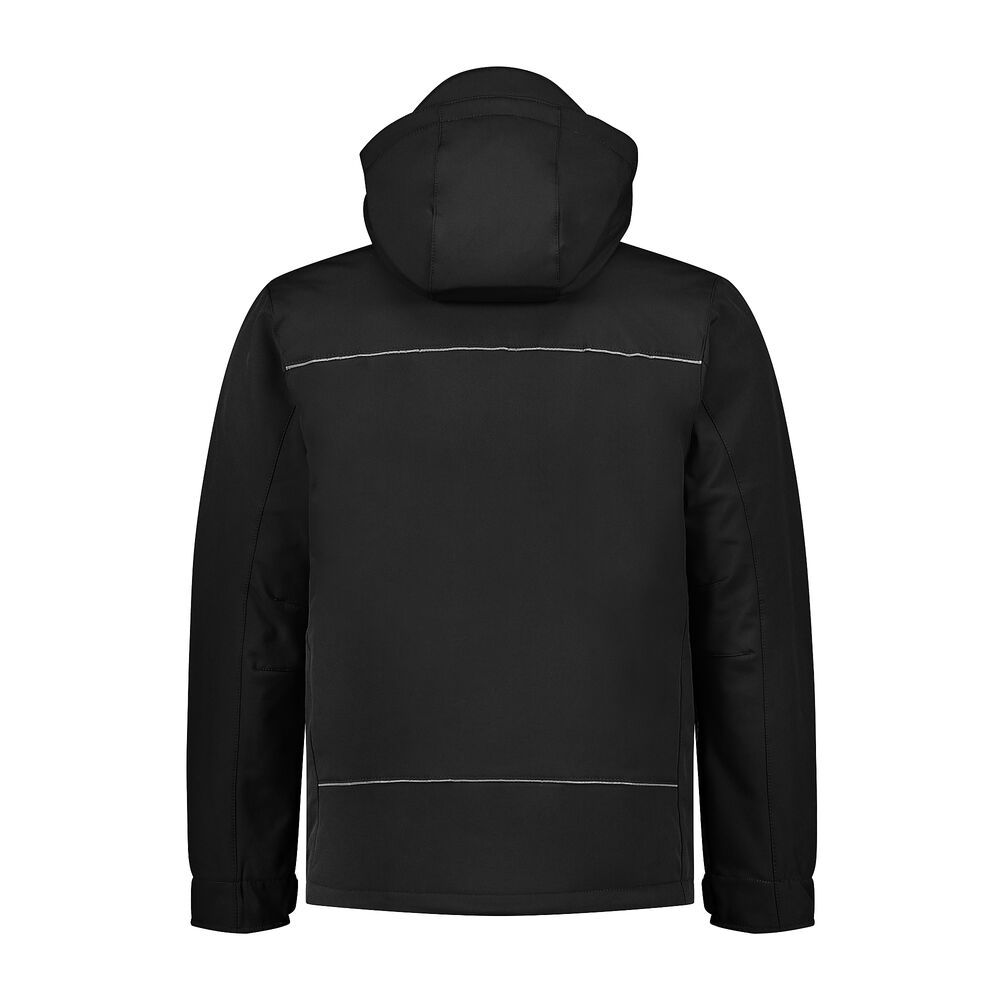 Softshell jacket, 94% polyester / 6% elastaan, 310 gr/m², 3 laags softshell, gewatteerd, regular fit met opstaande kraag, mouw met klitteband verstelbare manchetten en windvanger aan binnenzijde manchet, 2 steekzakken, borstzak en mouwzakje met YKK rits, winddicht, ademend, waterafstotend, binnenzak met rits en koptelefoonkabel doorgang, afneembare capuchon, reflectie piping op borst en rug, printersrits aan binnenzijde en onderzijde verstelbaar middels koord/stopper. (Alleen druktechnieken gebruiken die geschikt zijn voor stoffen als softshell.)
