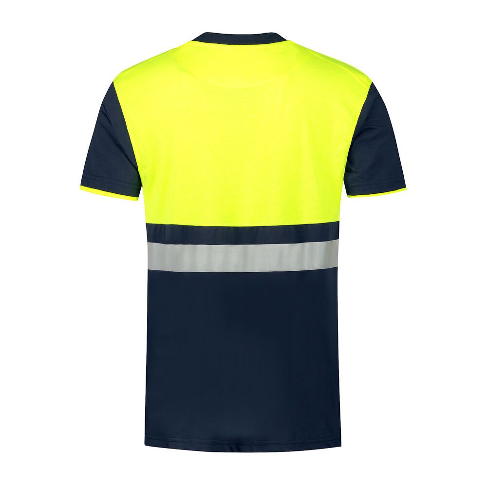 T-shirt, 70% polyester / 30% katoen, 190 gr/m², single jersey, regular fit met ronde hals en geel fluoriserend bovenstuk met getransfereerd 3M zilver reflectie tape.