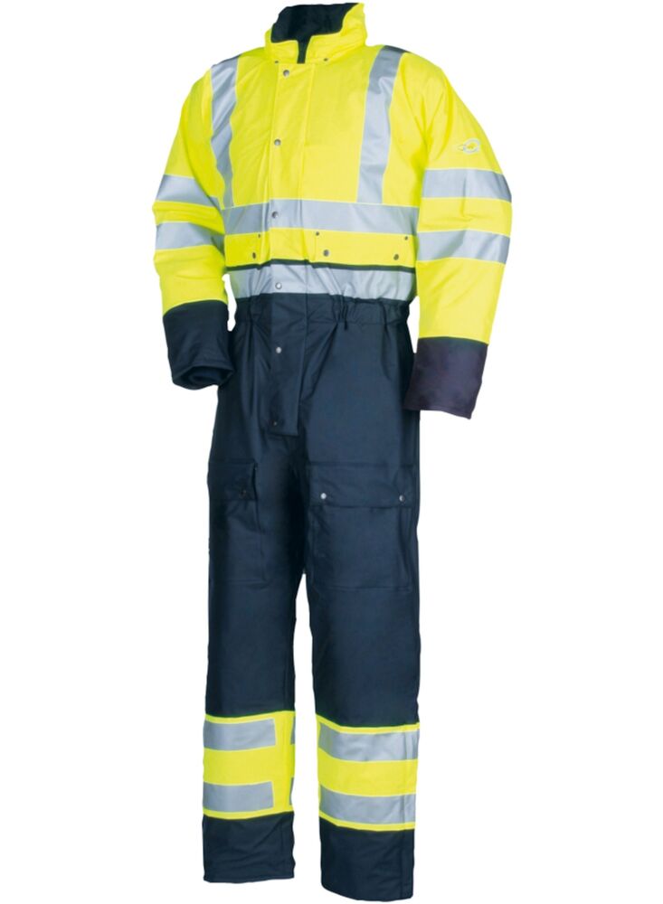 Tijdes de koude winterdagen wilt u niet alleen beschermd worden tegen koude, regen en wind, maar wilt u ook opvallen en gezien worden. Dit alles is mogelijk met onze signalisatie winter regenoverall Rabaul. De rechtopstaande kraag en de gebreide windvangers in de mouwen bieden extra beschutting tegen de snijdende wind terwijl de gewatteerde voering u een comfortabel warm gevoel bezorgt. Deze regenoverall in elastische en duurzame Flexothane® stof is voorzien van meerdere opbergzakken. De elastische vernauwing in de rug en de verborgen ritssluiting aan de broekspijp verhogen uw comfort. De kap kan worden opgeborgen in de kraag.