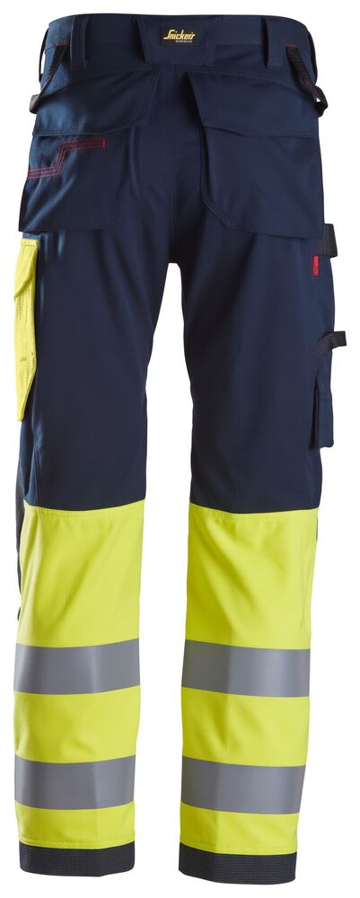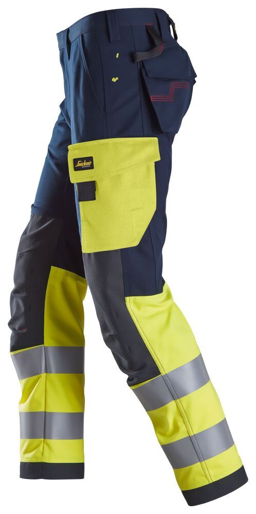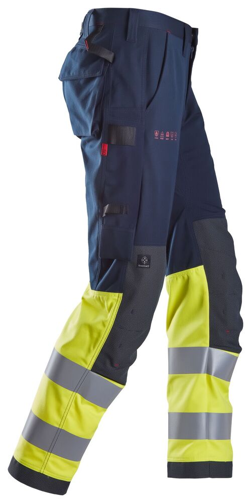 Beschermende werkbroek gecertificeerd als bescherming tegen elektrische vlambogen, voorzien van antistatische eigenschappen en intrinsieke bescherming tegen hitte en open vuur. Bovendien biedt het thermisch gelaste reflecterende accent in combinatie met het fluorescerende materiaal zichtbaarheid volgens Klasse 1. Dit zorgt voor hogere veiligheid onder slechtere lichtomstandigheden en in omgevingen met een hoog risico. KneeGuard® systeem en voorgebogen pijpen bieden extra kniebescherming en comfort, terwijl in de versterkte duimstokzak scherpe gereedschappen zoals schroevendraaiers een plek kunnen vinden. Goedgekeurd voor lassen en bijhorende werkzaamheden volgens Klasse 1.