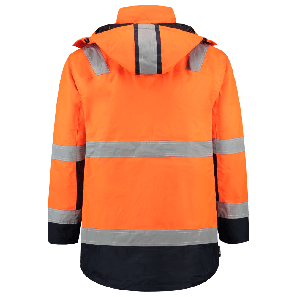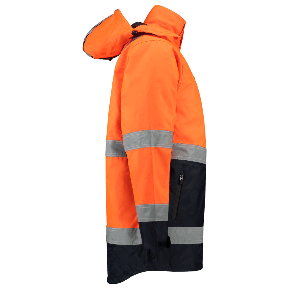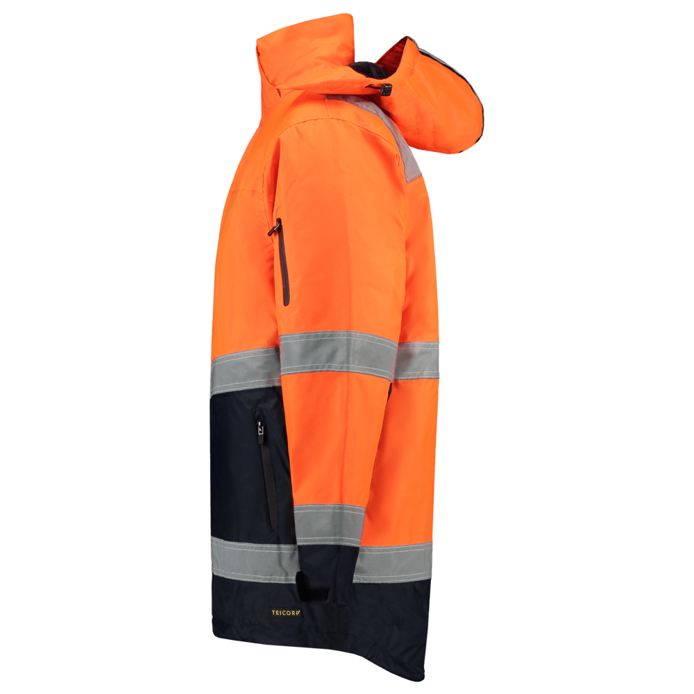 Deze tweekleurige High Visibility parka van het label Tricorp Safety is gemaakt van een sterke kwaliteit fluordoek en contrastdoek met een PU-coating. Wind-, waterdicht en ademend conform EN343 klasse 3:3. Voorzien van getapete naden en gelamineerde waterafstotende ritsen. Hoge zichtbaarheid conform EN ISO 20471:2013, Klasse 2. De parka heeft een afritsbare capuchon, steekzakken met een rits afsluitbaar, een binnenzak met rits geschikt voor een telefoon. Tevens voorzien van baardkapje, verlengd rugpand, printerrits, dubbele stormflap met waterkering en een verdekte drukknoopsluiting. Deze parka heeft een comfortabel uitneembaar thermo binnenjack dat separaat draagbaar is maar niet als werkjas te gebruiken.