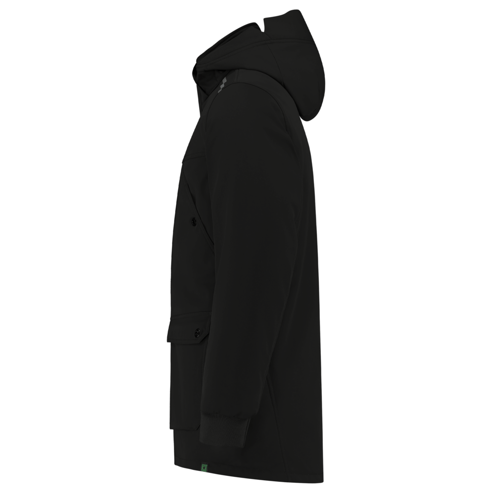 De naam ‘parka’ geeft het model van de jas al aan: de jas valt namelijk tot over de heupen. Dit geeft een zeer casual en moderne uitstraling. De borstzakken hebben een schuine opening en zijn afsluitbaar met een drukker. Ideaal om je handen in te steken zodat ze lekker warm blijven! Er zijn voldoende zakken aanwezig om al jouw handige work tools in op te bergen: zakken op het voorpand met intast aan de boven- en zijkant, twee binnenzakken en twee borstzakken afsluitbaar met drukkers. De ritssluiting is bedekt met een stormflap die afsluitbaar is met verdekte drukkers. De capuchon heeft een uitsparing aan de zijkant voor extra zicht en is volledig afneembaar middels drukkers. Om extra zichtbaar te zijn in het donker, is er op de schouders, de capuchon en op het achterpand een reflecterende print toegevoegd. Er is ook een printerrits aanwezig zodat je de jas eenvoudig kunt bedrukken.